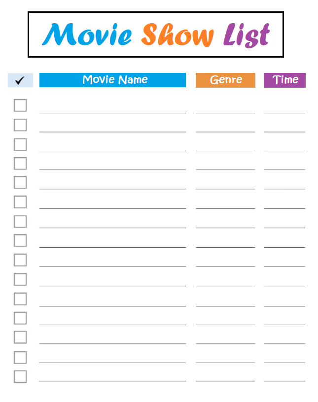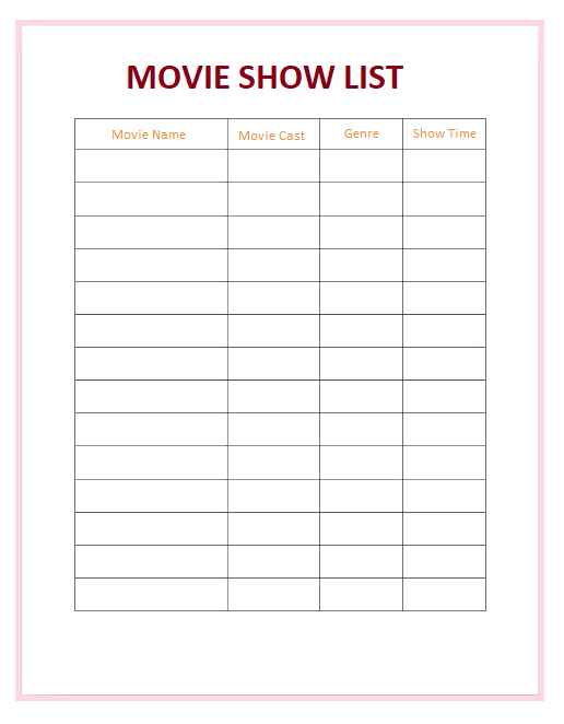 The movie show list template is a special kind of list that describes all the movies that are lined up to play in the cinema for a whole day, in the whole week or in a month. The cinemas display the various movie show lists of all the movies that help individuals to watch a movie show of their own at any day and time in the month according to their schedule. It is very essential for individuals, because sometimes individuals do not have the time to physically go to the cinema and purchase the movie show ticket of their choice. In this case, they book the ticket online. This saves time and money for individuals. The movie show list comprises the following information about all the movie shows that will be exhibited for the whole day and night; the particular time at which the specific movie show will be put on view, the date of the display of the movie show, the total time of the movie show, the price and the peculiar hall number where the movie show will display on screen.