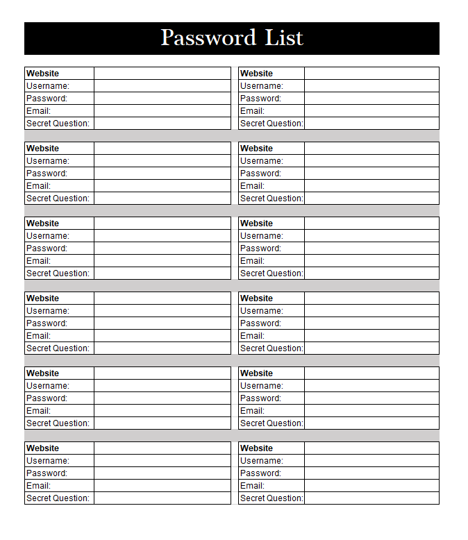 Printable Password List Template