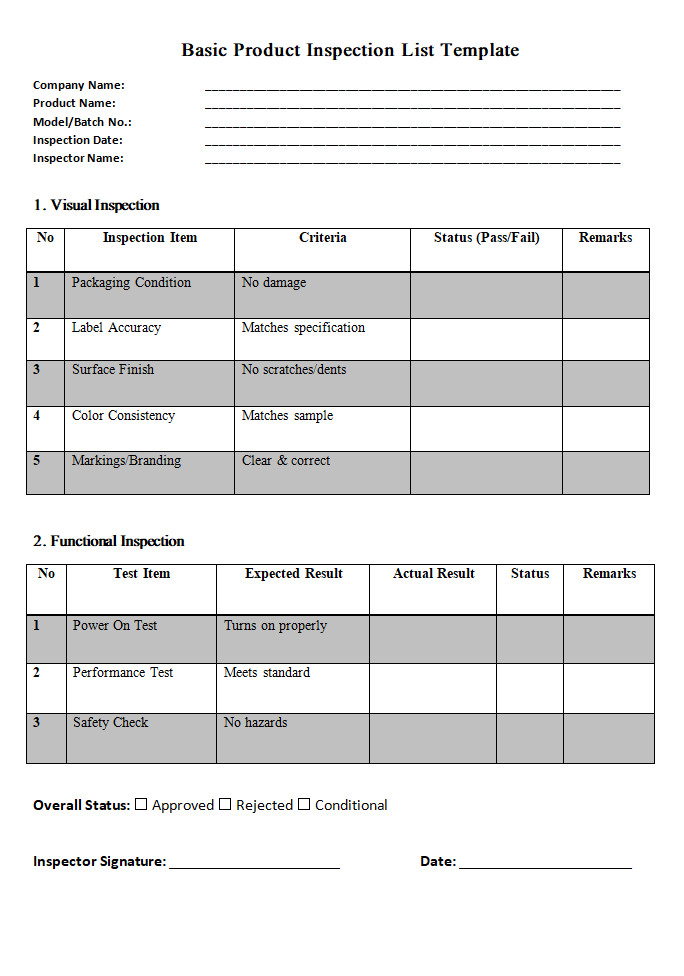A product inspection list template is a quality check tool which elaborates all the key elements that must be included in a product before being finalized. There is a specific criterion in which different standards and tests are recommended to be conducted by a team of inspectors, who are assigned to make sure a product is fully ready and complete in all respects. Moreover, it serves as a standardized checklist for inspectors or quality control officers to ensure consistent evaluation of a product, its appearance, functionality, packaging, and labeling. In addition, they are also responsible for completing the inspection in such a way that it reduces defects and customer complaints.