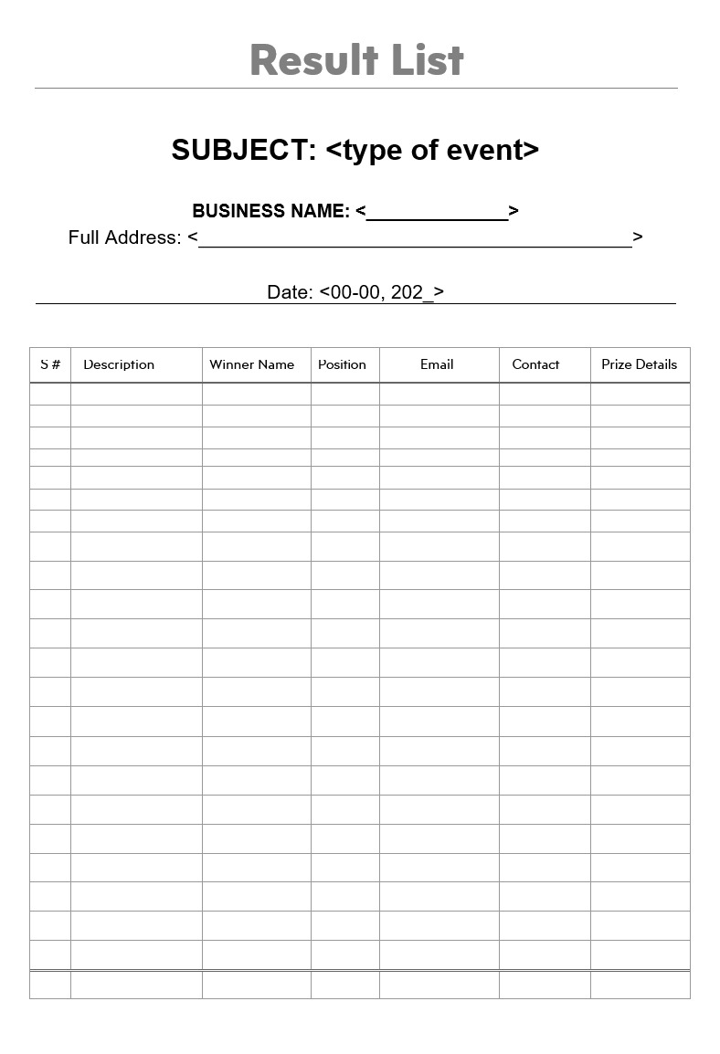 A result list template works as a concise document that completely describes the results of winners and those who fail to accomplish them. Basically, results lists are prepared to announce the details of persons who are declared as winners, and it is often called a list of accurate judgments. Moreover, it is a list that consists of information which is obtained by an authorized body after several experiments or scientific analysis made on behalf of the calculation of quantities. However, people can look up their results from a list that is exceptionally prepared by the supreme authority, who announce the declaration of winners through a comprehensive result list prepared under the outcome of numerous formulas. Generally, a result list comes with different types and in each type, it has several branches. For instance, prize-bound result list, examination result list, search result list, winners result list, and candidate result list.